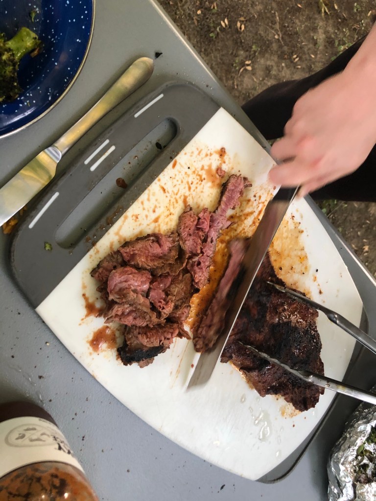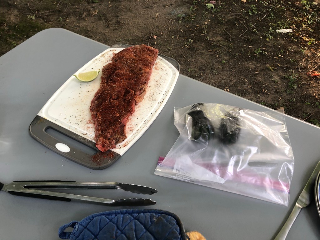 We opted to wait until we had a nice combination of white/red hot coals and a little bit of fresh dry wood for a nice fired crust on the meat. As with any meat, you’re looking for a nice density (there are tons of articles online about how to feel when your meat is done). And you want all that spice rub to crust up a little bit. Your final product should be nicely crusted and still juicy when you cut into it. Flip it when it looks like the ends are starting to tighten up and maybe even curl a bit. This advice doesn’t apply to all cuts of meat, but certainly skirt steak.