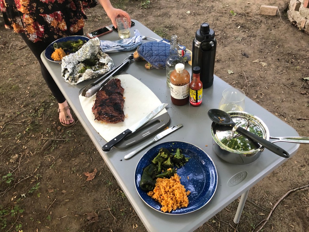 While you spice the meat, consider having your rice boiling on a burner inside. Its no biggie if you find that the rice is done first, you can always bring the pot outside and put it on the edge of the firepit to keep it warm (just don’t forget the lid or it will dry out and become gummy!)